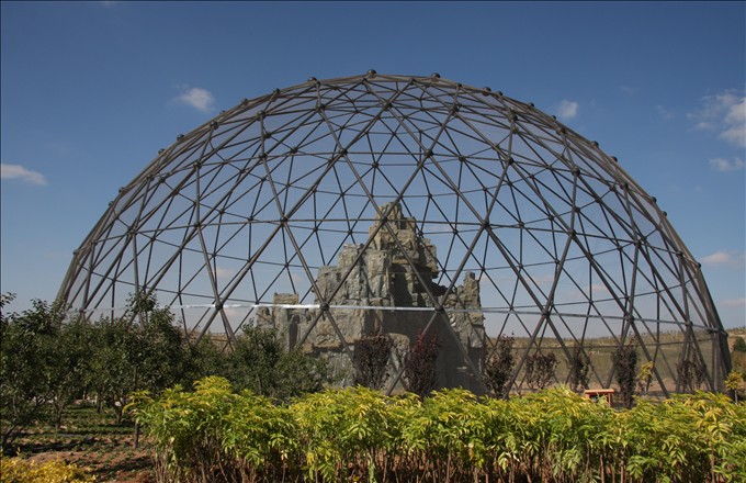猛禽苑:主體為半球冠形單層鋼網(wǎng)殼造型的猛禽苑高30米,跨度60米,底部直徑60米,子單元均為三角形,由15個(gè)支座均分地面圓周360度。圍護(hù)面積677.06平方米,室外觀賞平臺(tái)面積為39.2平方米,平臺(tái)下部室內(nèi)建筑面積637.86平方米。